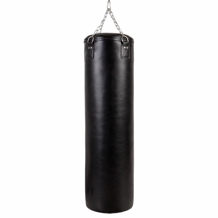 Боксерский мешок из натуральной кожи — надежный тренажер для отработки ударов и развития навыков бокса и боевых искусств. Крепится к потолку или стойке с помощью прочной цепи, обеспечивая устойчивость и безопасность во время тренировок. Изготовлен из высококачественной натуральной кожи, толщиной 2 мм, которая не продавливается при ударе, обладает отличной амортизацией и выдерживает даже самые мощные удары руками и ногами. В качестве наполнителя используется резиновая крошка и ветошь. Мешок имеет цилиндрическую форму диаметром 30 см, высотой 130 см, вес составляет 58-63 кг.