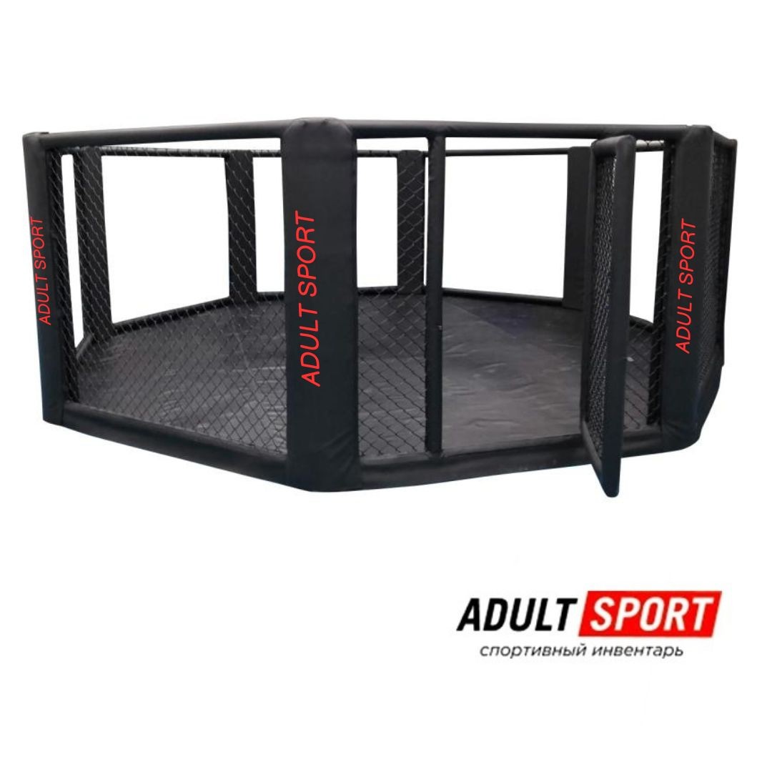 Октагон для боевых искусств и ММА представляет собой оборудованную площадку в виде правильного восьмиугольника. Одно из ключевых отличий клетки-октагона от обычного, классического ринга – это отсутствие углов, что позволяет избежать запираний или затяжек. Площадка устанавливается на специальную платформу, обнесенную по периметру защитной сеткой, напольная поверхность покрыта матами. Октагон ADULT SPORT без помоста обычно устанавливают непосредственно на полу зала. Его можно назвать бюджетным вариантом, так как он легче в сборке и сравнительно недорог. Диаметр кольца составляет 6 м. Стенки клетки выполнены из металлической сетки с полимерным покрытием. Размер ячеек составляет 50х50 мм, высота сетки 1,83-2 м, а толщина проволоки — 3,5мм, что обеспечивает ей высокую прочность. Полимерное покрытие защищает от коррозии. Основой секций служит профильная труба размером 40х20х2мм, которая придает клетке устойчивость и жесткость. Для усиления конструкции используется металлический уголок размером 50х50х5мм. В качестве дополнительной защиты предусмотрен мягкий настил секций из пенополиэтилена (ППЭ) толщиной 40мм, покрытый прочным материалом ПВХ плотностью 650 г/м², что минимизирует риск травм при контакте.
