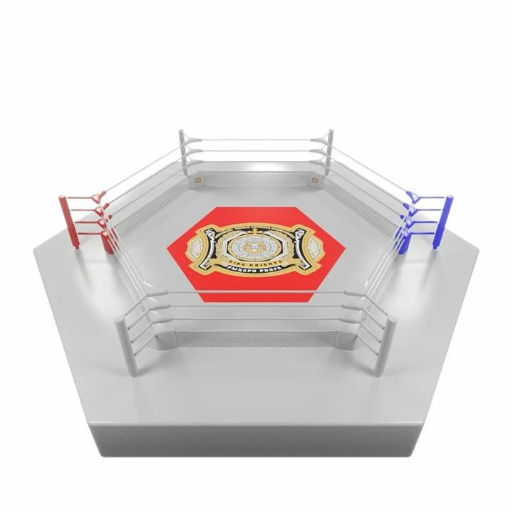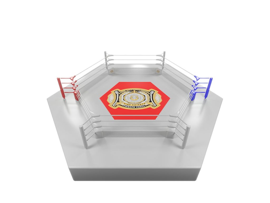 Ринг шестиугольный выполнен согласно стандартов и правил смешанных единоборств. Размер 8х8 по диагонали, расстояние между ближними столбами 6 метров. Монтажная площадка 10х10 метров. Помост выступает на 0.8 метра. Высота помоста 1 метр.