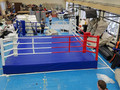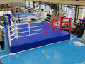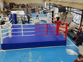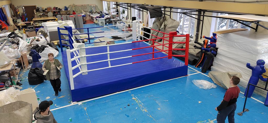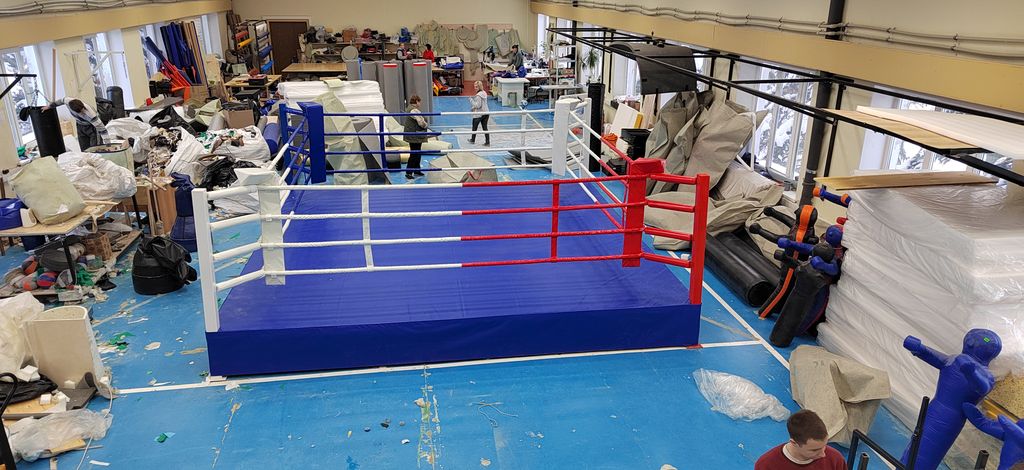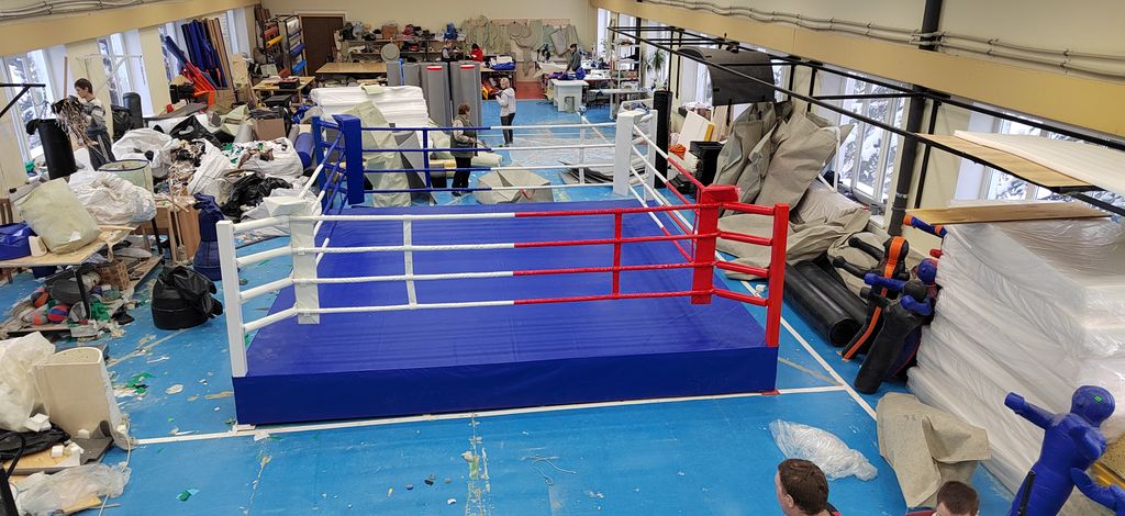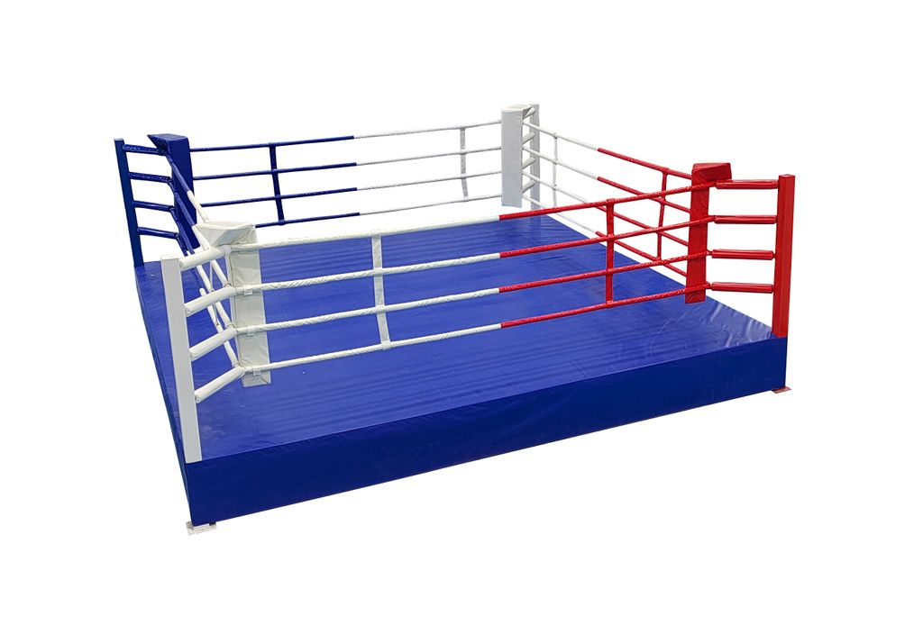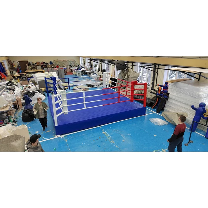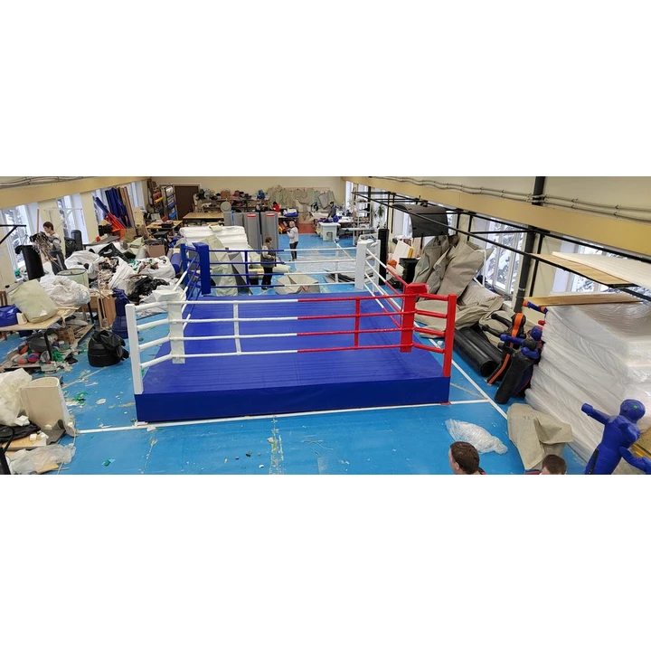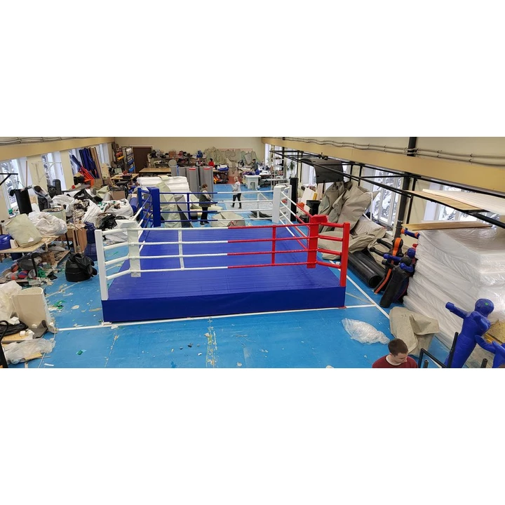 Ринг на помосте прекрасно подходит для проведения тренировок и соревнований по боксу и другим видам контактного кулачного боя. Устанавливается чаще в закрытых помещениях, т.к. там ринг менее подвержен воздействию агрессивных факторов окружающей среды. При желании его можно установить и на улице, даже и на не очень ровной поверхности, компенсировать которую можно регулировками помоста, в этом его большое преимущество перед напольными рингами. Основой ринга служит ферма собираемая из металлических рам, скрепленных между собой болтами. Поверх фермы устанавливаются листы фанеры, они же и образуют пол боксерского ринга. На фанеру укладываются листы мягкого настила из матов ПВВ и накрываются покрытием из ПВХ. Объём 10.00 куб/м, вес 1500кг