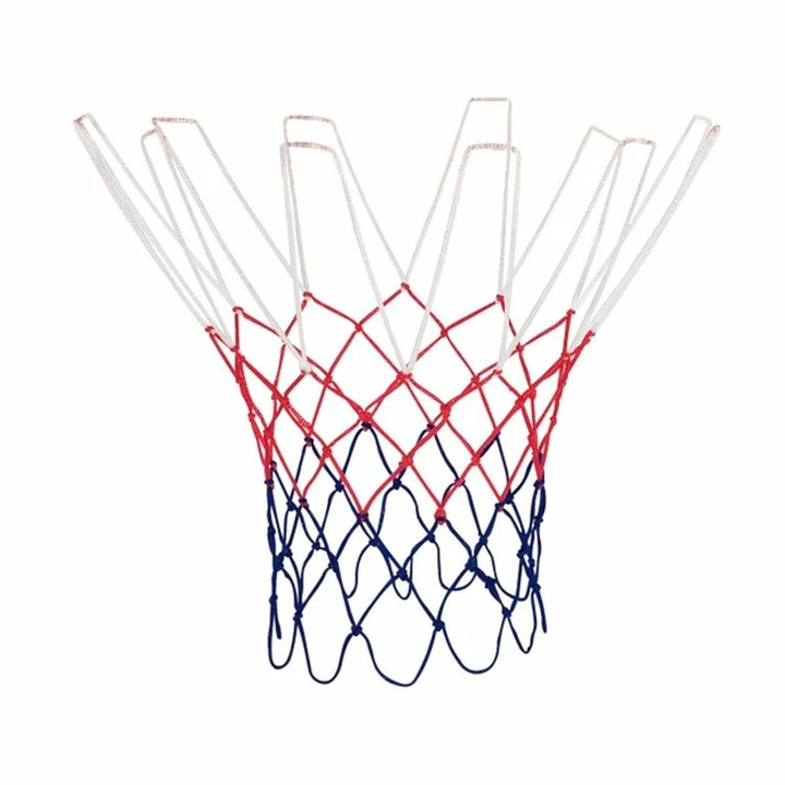 Сетка баскетбол Д=5,0 мм, цв триколор ПП (1 шт.). Баскетбольная сетка фиксируется на кольце при помощи специальных креплений- петель. На каждой сетке должно быть провязано 12 петель.
