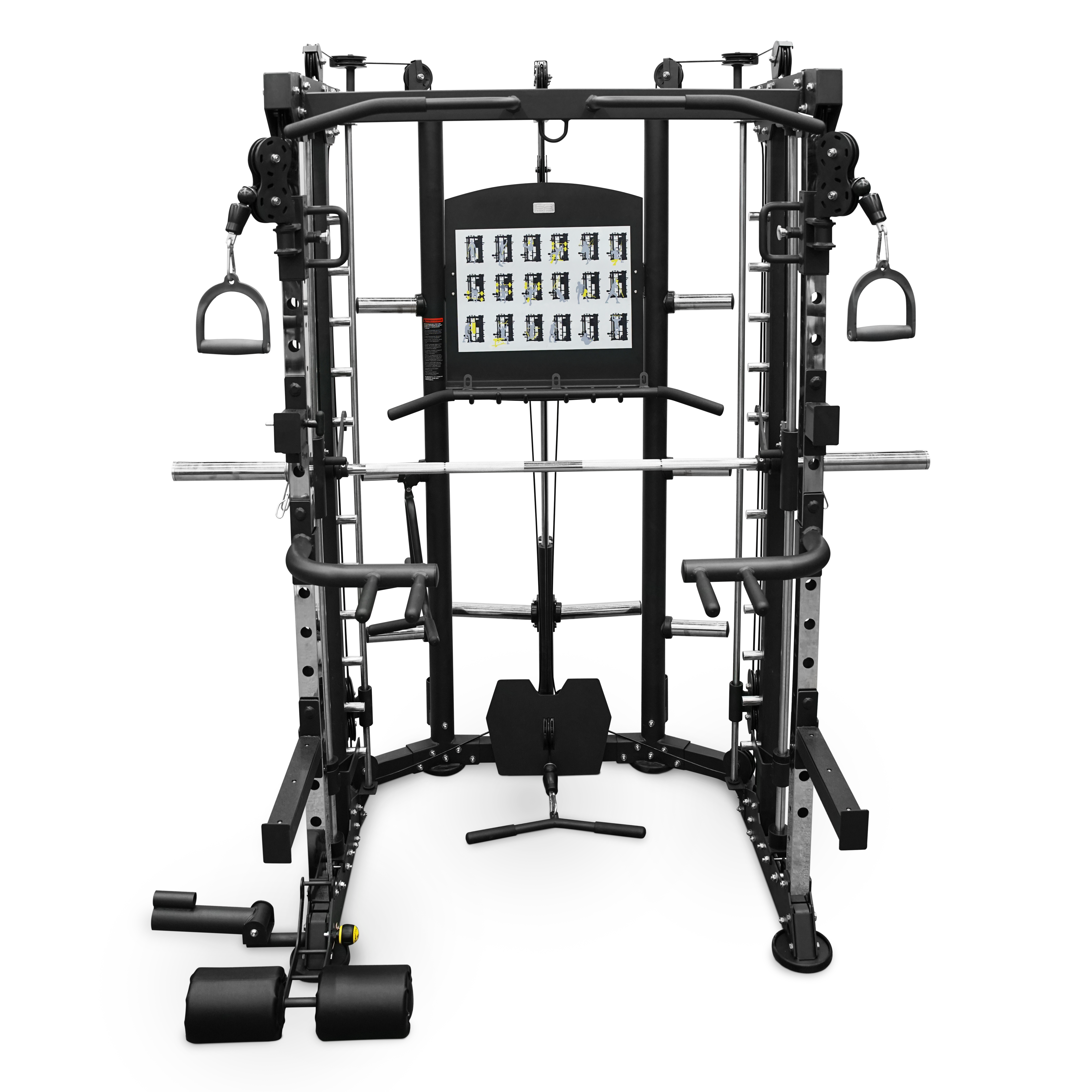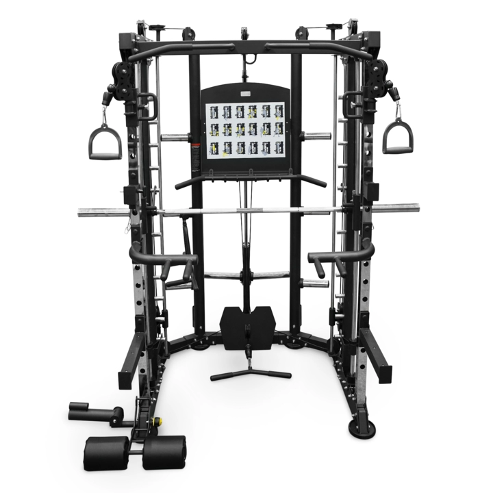 BRONZE GYM TRUCK- профессиональный тренажер коммерческого класса. Данная модель подходит для выполнения большого количества упражнений на развитие различных групп мышц. BRONZE GYM TRUCK оснащен огромным количеством различных полезных элементов. Тут и машина Смита, и набор всевозможных тяг, турник, брусья, что только может душа пожелать. И при этом инженеры BRONZE GYM смогли уместить такой богатый функционал в габариты весьма компактной мультистанции. Это не только идеальный вариант для небольшого спортзала с невысокими потолками, но и отличный выбор для домашней студии. Это именно коммерческий тренажер с соответствующим высочайшим запасом прочности и надежности. Рама и все элементы выполнены из стальных профилей и рассчитаны на максимальный вес пользователя в 150 кг. Порошковая покраска крайне устойчива к сколам и царапинам. Все ролики собраны на базе промышленных подшипников, а толщина тросов рассчитана на серьезные весовые нагрузки. Устойчивые платформы имеют резиновое покрытие, не оставляют следов и не царапают напольное покрытие. Конструкция схожа с блочными тренажерами, Но сопротивление создают стандартные блины, которые необходимо навесить на стек в тыльной части конструкции. По направляющим стек двигается плавно и не создает ненужного шума. - Одной из основных частей является машина Смита. Имеются специальные противовесы, аккуратно и незаметно спрятанные внутри труб рамы. Так что пустой гриф практически ничего не весит. - В комплекте идёт узкая тяга, широкая тяга и пару отдельных рукоятий. Нижняя тяга оборудована стальной платформой для упора ног, а высоту боковых можно удобно и просто регулировать всего одной рукой. Для работы с свободными весами в виде штанги, например, имеются съёмные регулируемые опоры. Пара коротких для приседов и жимов, например, и пара длинных для различных тяг или просто ограничение амплитуды движения и подстраховки. В нижней части, справа или слева, можно закрепить уключенну для так называемого ТВ-грифа, причём в комплекте идёт специальная рукоять для широкого и узкого хвата. Можно выполнять как симметричные и односторонние тяги в наклоне на спину, так и жимы на плечевой пояс и верхнюю часть груди. Для тренировки с собственным весом тренажёр оснащён брусьями для отжиманий и, конечно, полноценным турником. Брусья регулируются по высоте под любой рост и имеют две опорные рукоятки под узкий и широкий хват. Турник также позволяет подтягиваться различными хватами, как и брусья. В местах контакта с ладонями покрыт хватки и износостойким резиновым покрытием. Настраиваемые упорные валики для ног позволяют выполнять скручивания на пресс или фиксировать колени для тренировки мышц спины с верхней тягой. Рядом с турником имеется крепление для подвеса различного инвентаря от резинок для фитнеса и TRX до боксерского мешка или груши. А еще большое количество мест для размещения блинов различного веса и две подставки для грифов. В центральной части на стальном щите разместили информационный материал с подробным указанием всех доступных упражнений, а ниже — ряд крючков для крепления тяг, рукояток или иного инвентаря. BRONZE GYM TRUCK похож на швейцарский складной нож при весьма компактных внешних габаритах в нем есть все необходимое для полноценной тренировки на все тело и даже немного больше при этом функционал явно 