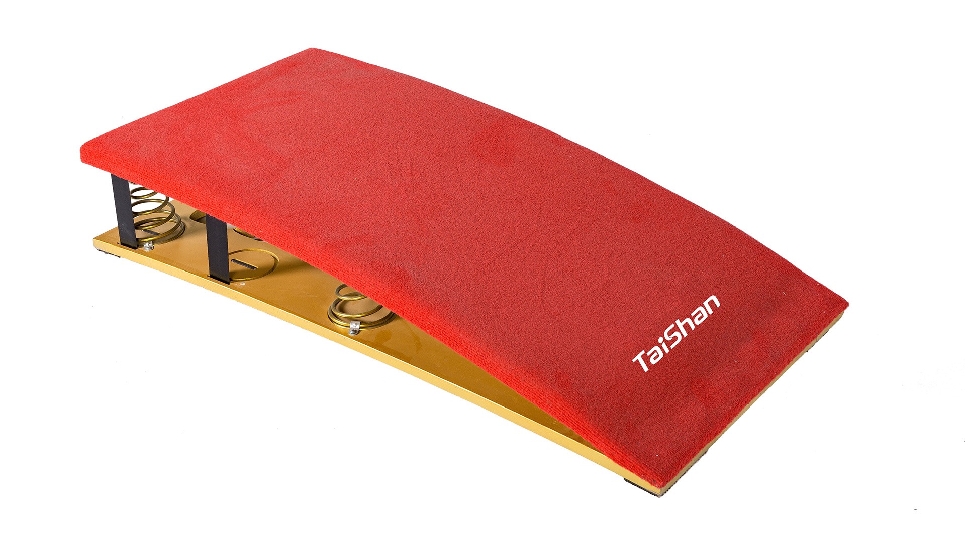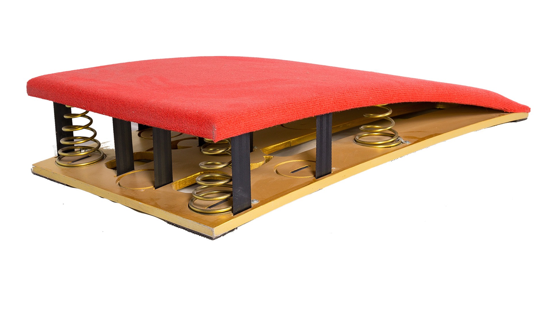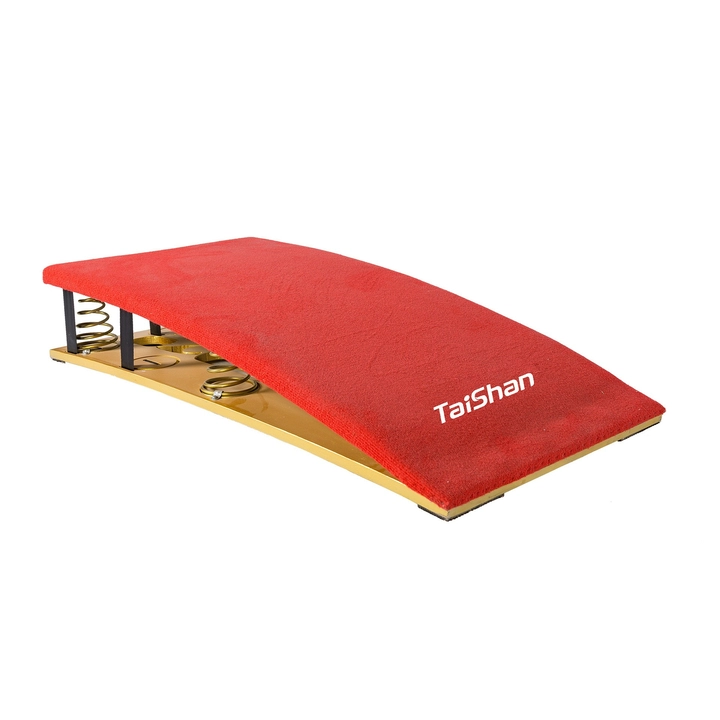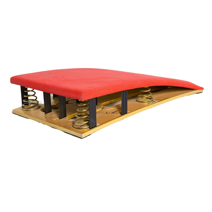 Мягкий пружинный мостик (5 пружин) используется для облегчения прыжков. Многослойная композитная древесина, армированная стекловолокном, устойчива к разрушению и обеспечивает длительный срок службы. Поверхность покрыта серым ворсистым ковровым покрытием, приклеенным к слою высокоэластичной резины и поролона толщиной 2 см, что значительно повышает амортизационные свойства. Нижняя часть оснащена специальной противоскользящей накладкой, способствующей более эффективному выполнению сложных элементов спортсменами. Конструкция точно центрируется пятью коническими пружинами разной высоты; основание оснащено устройством предотвращения соскальзывания. Размеры: длина 120 см × ширина 60 см × высота 22 см. Вес: 26 кг. Сертификат FIG.