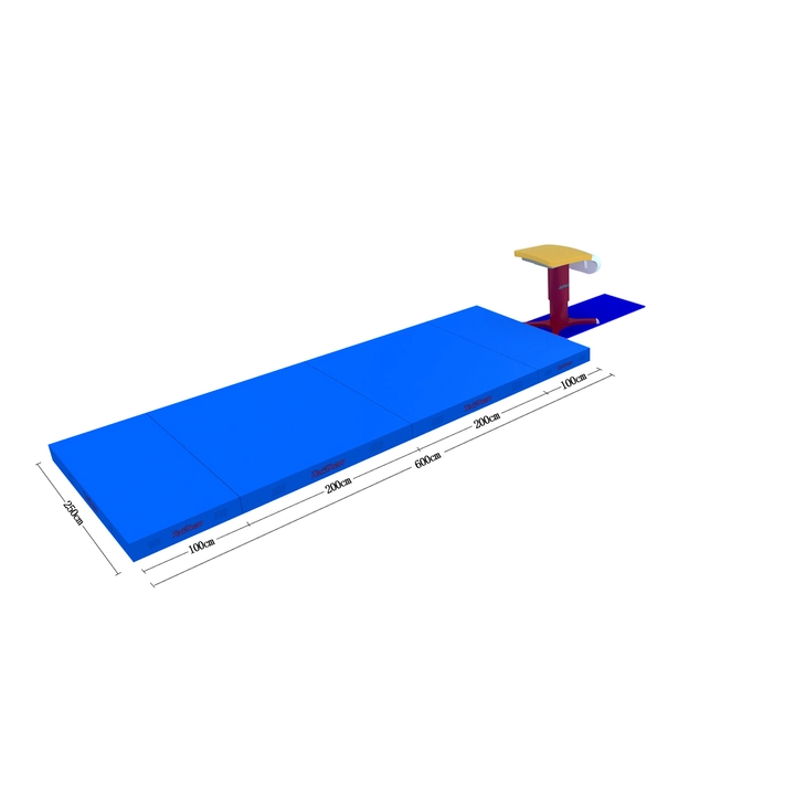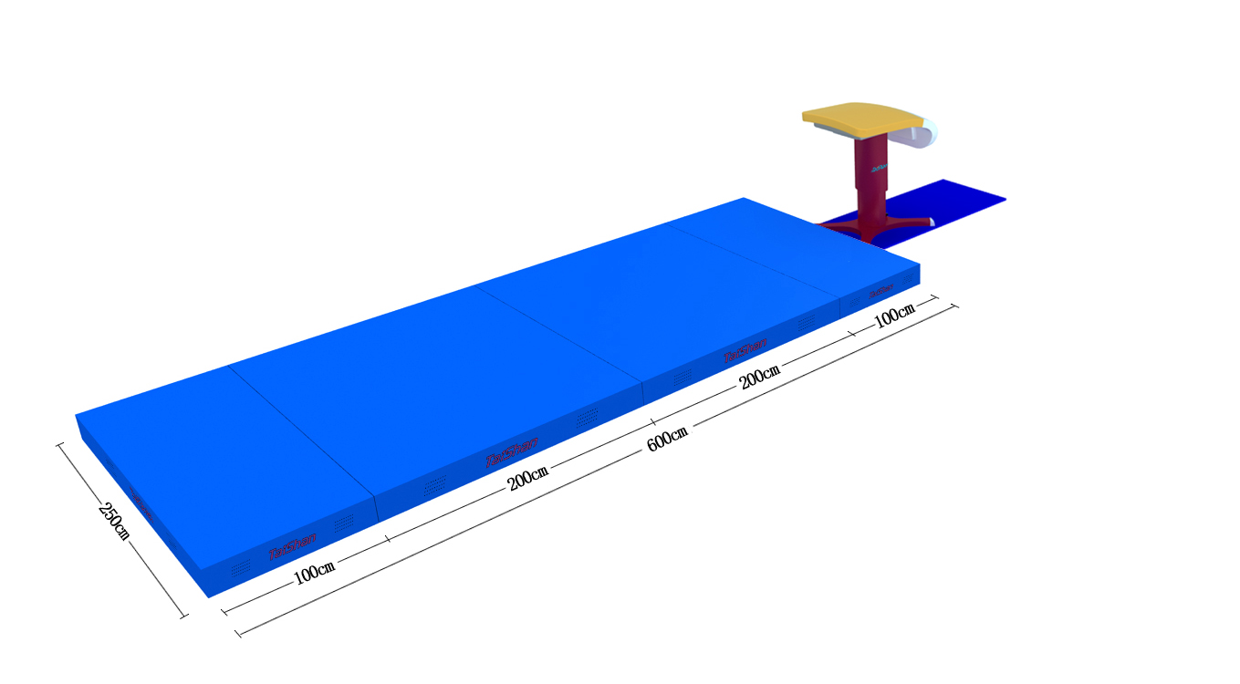 Данный продукт используется для защиты во время соревнований и тренировок по опорному прыжку. Материал покрытия: ПВХ-тканый материал. С обеих сторон расположены вентиляционные сетки и воздушные отверстия. Ручки предназначены для удобства перемещения. Маты соединяются между собой с помощью липучек. Внутренний слой выполнен в симметричной «сэндвич»-структуре из пены. Размеры (Д × Ш × В): 6000 мм × 2500 мм × 200 мм. Материал: покрытие из ПВХ-тканого материала; внутренний наполнитель — высококачественный поролон и XPE-пена. Цвет: голубой (Pantone 2173C). Сертифицирован FIG. Используются с соревновательным столом для прыжков TQ1005B. Количество упаковок: 4. Вес брутто: 202 кг.