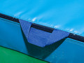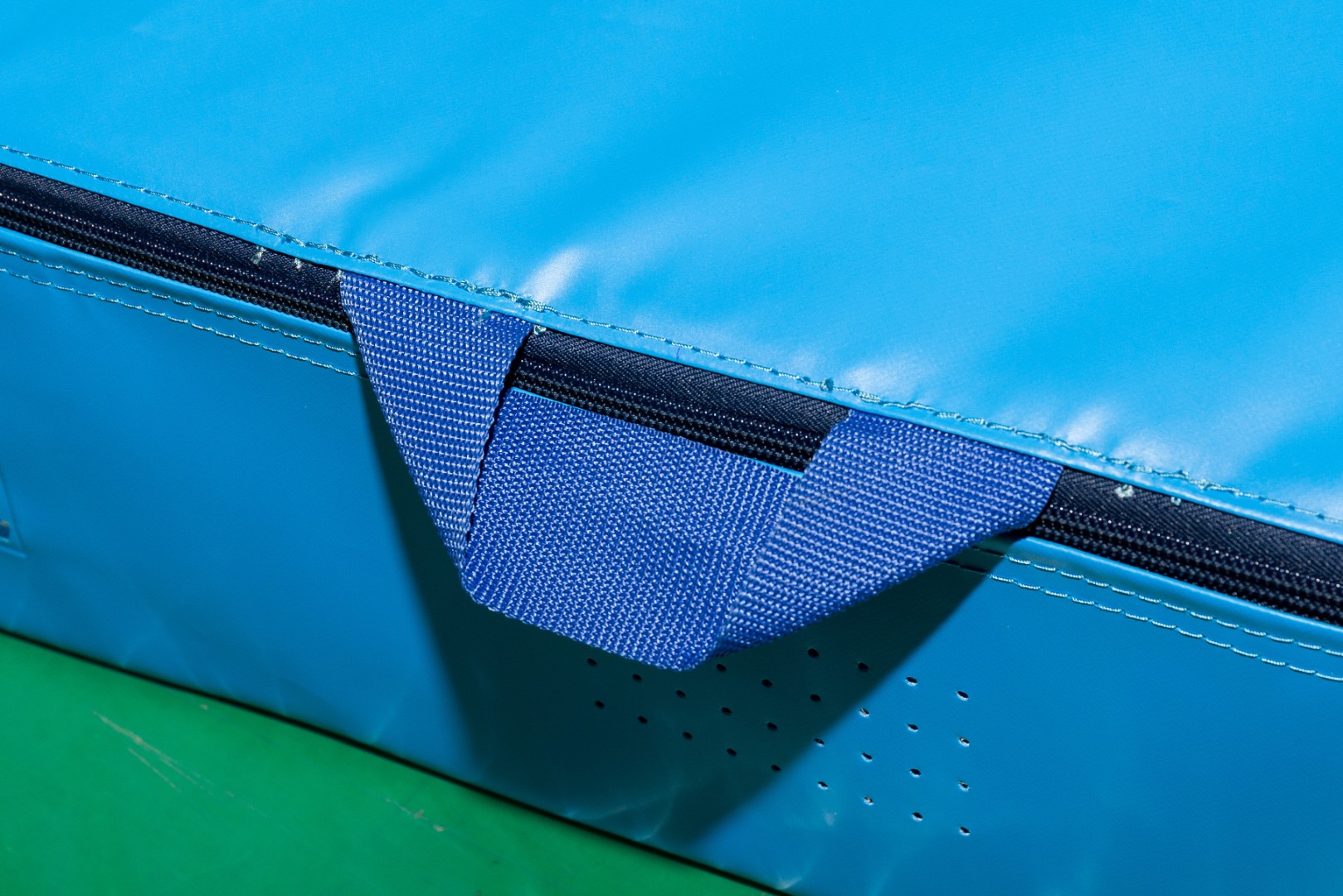 Зона приземления для соревновательного бревна. Чехол изготовлен из экологичного ПВХ-тканого материала, обеспечивающего комфортную и износостойкую поверхность. На боковой части предусмотрены вентиляционная сетка и воздушные отверстия для эффективного выхода воздуха. Ручка-ремень, размещённая снизу, облегчает переноску и перемещение защитного мата. Каждая секция мата соединяется с помощью липучек, что обеспечивает удобную разборку, сборку и надёжность соединения. Мат использует комбинированную структуру наполнителя, что способствует защите спортсменов и снижению риска травм. Покрытие из ПВХ, внутреннее наполнение из XPE и поролона, вентиляционные сетки и воздушные отверстия, ручки. Размеры: длина 18000 мм × ширина 4000 мм × высота 200 мм. Цвет: светло-голубой (Pantone 2173C). Вес брутто: 543кг. Сертифицировано FIG. Используется с сертифицированным гимнастическим бревном TQ1007B.