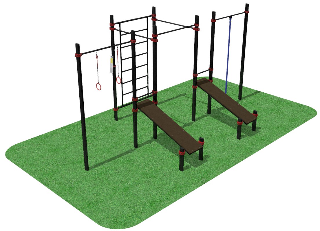 Многофункциональный комплекс — универсальное спортивное оборудование для комплексной проработки всех групп мышц: спины, груди, пресса, рук и ног. Комплекс включает три турника, две скамьи, гимнастические кольца, канат и шведскую стенку, что позволяет выполнять подтягивания, отжимания, подъемы ног и другие силовые и гимнастические упражнения. Конструкция состоит из 12 опорных столбов из плоскоовальной трубы сечением 100×50 мм и толщиной стенки 3 мм, высота комплекса 2600 мм, длина 5300 мм, ширина 2900 мм. Диаметр перекладин турников, шведской стенки и перекладин для колец и каната — 33,5 мм, перекладины крепятся к опорным столбам с помощью хомутов. Скамьи для упражнений на пресс выполнены из влагостойкой фанеры толщиной 21 мм, канат изготовлен из прочного капрона. Надёжная стальная конструкция и продуманная геометрия элементов обеспечивают высокую устойчивость, долговечность и безопасность во время тренировок.