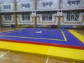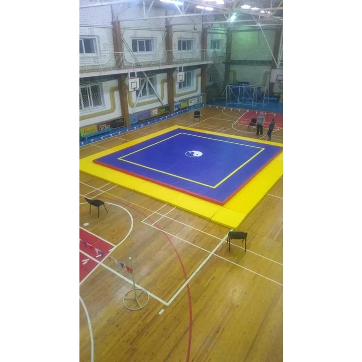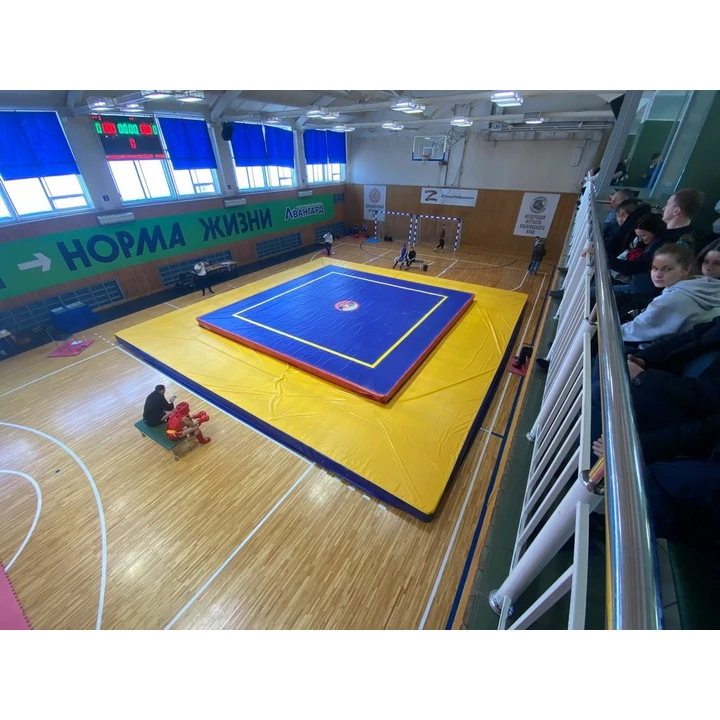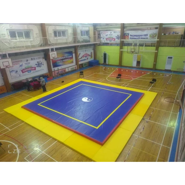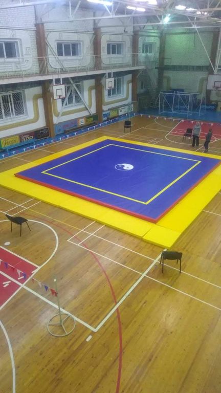 Описание: Помост для соревнований и боев по ушу саньда это платформа, сделанная из железа и дерева, размером 8 x 8 (м), высотой 20 см на неё выкладываются матами ППЭ 1х2 м и поверхность накрывается из ПВХ-ткани (нескользкой) производство Корея. В центре арены для саньда мы можем нанести любой логотип по вашему пожеланию, на данной картинке нарисована диаграмма (Инь-Ян) диаметром 1 м. По краям помоста проводится сплошная красная линия шириной 5 см. Ограничительная линия, шириной 10 см, желтого цвета наносится на расстоянии 90 см от края помоста. Защитные маты, шириной 2 м и от 20 см до 40 см толщиной, должны быть размещены вокруг помоста по правилам саньда(не входят в стоимость помоста)