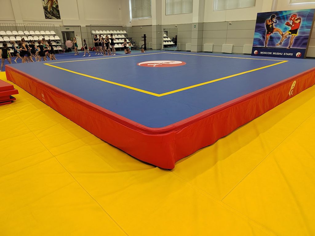 Описание:Помост для соревнований и боев по ушу саньда это платформа, сделанная из железа и дерева, размером 8 x 8 (м),высотой 60см на неё выкладываются матами ППЭ 1х2х0,04м и поверхность накрывается из Искуственной кожи(нескользкой) производство Китай.В центре арены для саньда мы можем нанести любой логотип по вашему пожеланию, на данной картинке нарисована диаграмма (Инь-Ян) диаметром 1 м.По краям помоста проводится сплошная красная линия шириной 5 см.Ограничительная линия, шириной 10 см, желтого цвета наносится на расстоянии 90 см от края помоста.Защитные маты, шириной 2 м и 40 см толщиной, должны быть размещены вокруг помоста по правилам саньда( ВХОДЯТ в стоимость помоста)