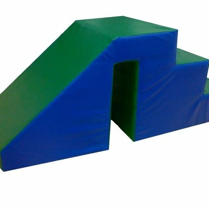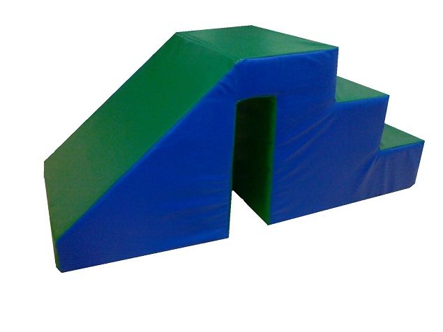 Спуск в бассейн (простой). Спуск в бассейн используется в качестве дополнительного модуля, который приобретают к бассейну из мягких модулей. С одной стороны удобная лесенка с тремя ступеньками, а с другой - небольшая горка. Неразборная конструкция. Горка для сухого бассейна выполнена из плотного поролона и обтянута мягкой, приятной на ощупь винилискожей. В середине есть специальное углубление, благодаря которому спуск легко надевается на бортик бассейна. Мягкий модуль спуск в бассейн подбирается под высоту бассейна. Размер: 135х50х60