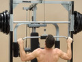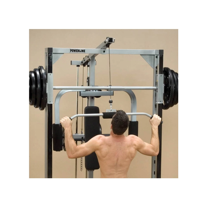 Опциональная верхняя тяга для машины Смита PSM144. В качестве весовой нагрузки используется 1 стек из 15 плит с общим весом 68 кг. “SP150” (в комплект не входит).