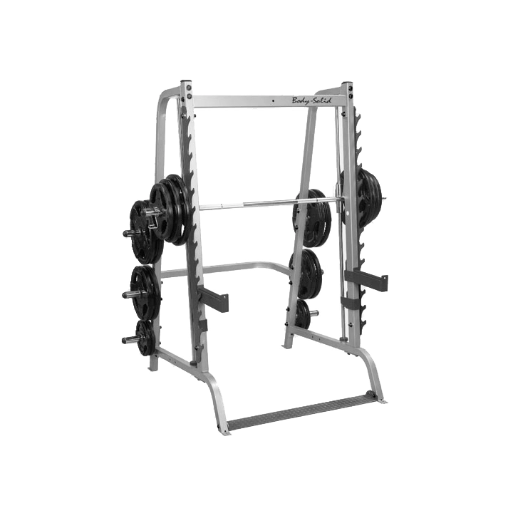 Машина Смита с наклоном рамы 7 градусов создает естественность движений при выполнении упражнений для верхней и нижней части тела. Мощная цельносварная станина из профиля 50*76 мм. обеспечивает максимальную безопасность, прочность и устойчивость. Благодаря 20 точкам вертикальной фиксации штанги нагрузку можно отрегулировать под любого атлета и при необходимости надежно зафиксировать в любой момент движения. Штанга весом 11 кг. мягко и плавно перемещается по хромированным направляющим. Чрезвычайно прочные регулируемые предохранительные приспособления пригодны как для работы в тренажере Смита, так и для упражнений со свободной штангой. Удобный стеллаж для дисков имеет 14 позиций. Дополнительное оборудование: 1. Body Solid GLA348S - верхняя тяга; 2. Body Solid GPA-3 - баттерфляй.