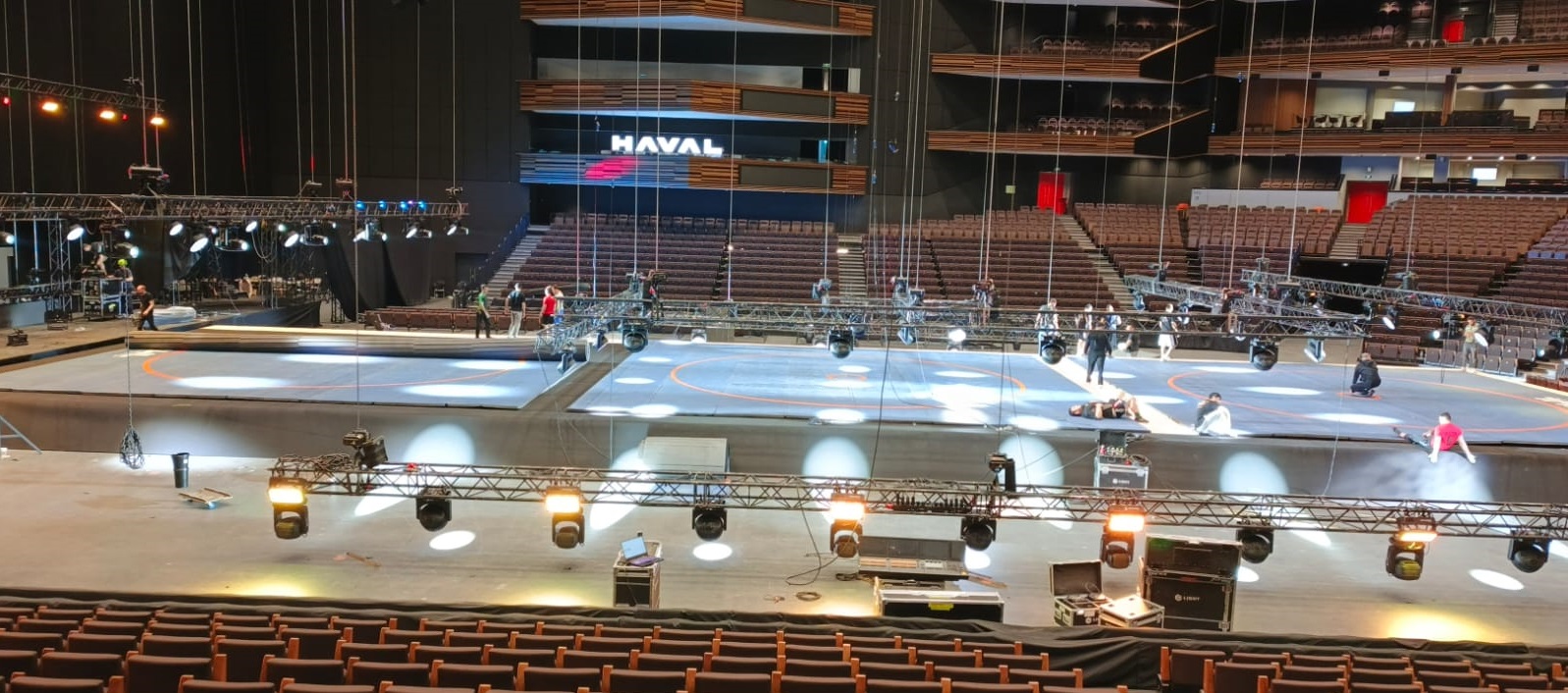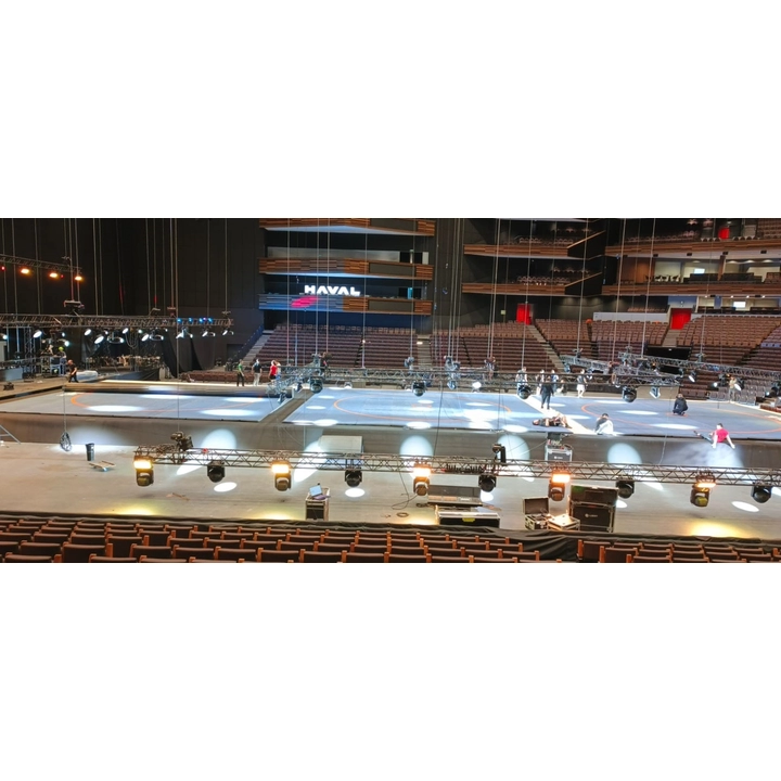 Изделие состоит из 8 рулонов шириной по 1,5 м, общей площадью 144 м². Основа выполнена из химически сшитого пенополиэтилена (ППЭ) — прочного, упругого и влагостойкого материала. Верхний слой — винилискожа с износостойким, антискользящим и воздухопроницаемым покрытием. Благодаря сегментированной структуре мат легко скручивается в рулон, что удобно для транспортировки и хранения. Система соединения Velcro (липучка) по краям рулонов позволяет создать цельное покрытие без стыков, обеспечивая безопасность спортсменов.