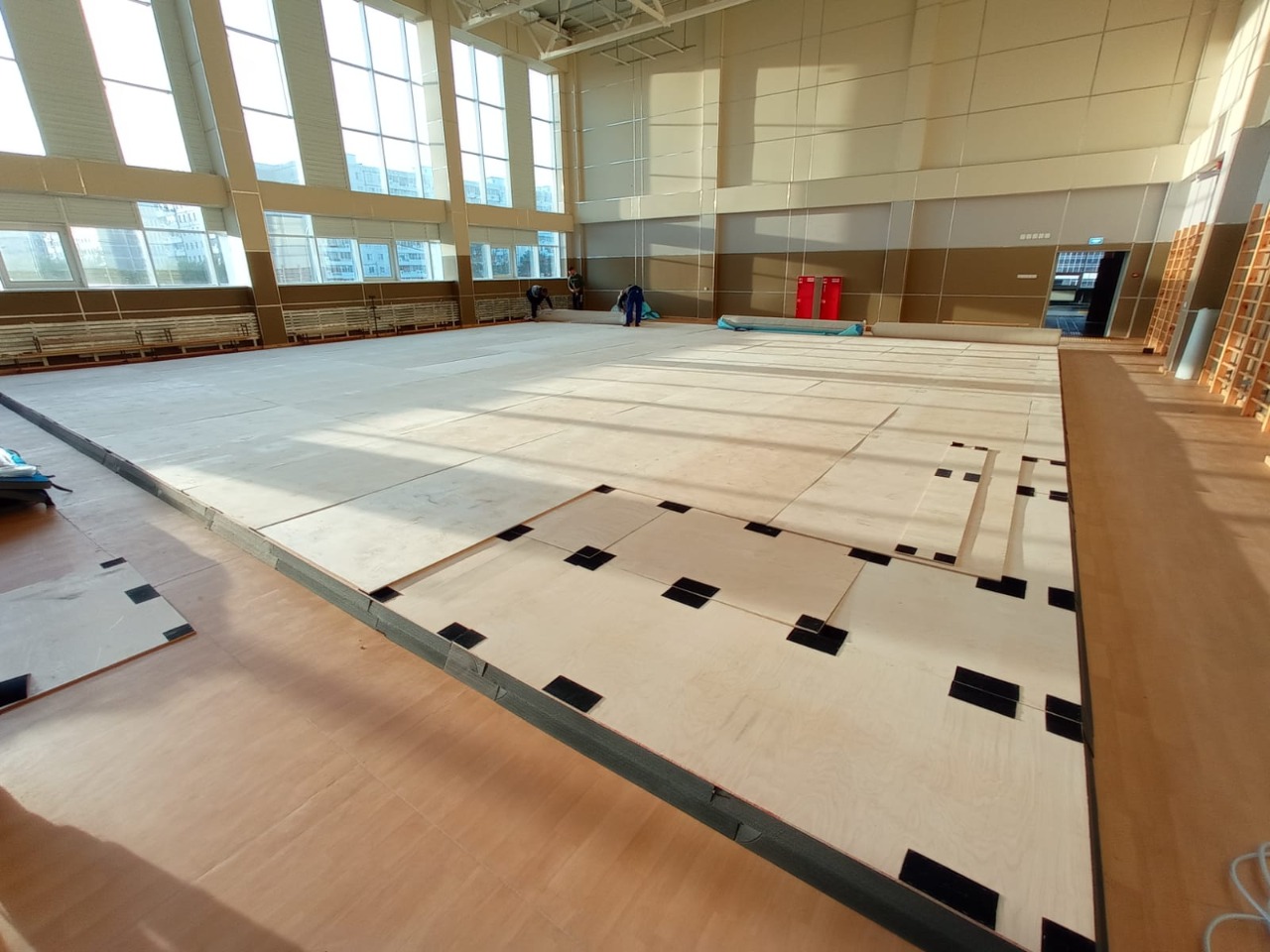 Помост для художественной гимнастики с амортизаторами 14х14м. Гимнастический помост состоит из отдельных секций, выполненных из влагостойкой фанеры толщиной 15 мм. На каждой секции установлены квадратные блоки из вспененного пенополиэтилена (ППЭ) для отличной амортизации при выполнении упражнений. Секции соединяются по схеме «шип–паз» с использованием крепежных металлических пластин, обеспечивающих надежное соединение.