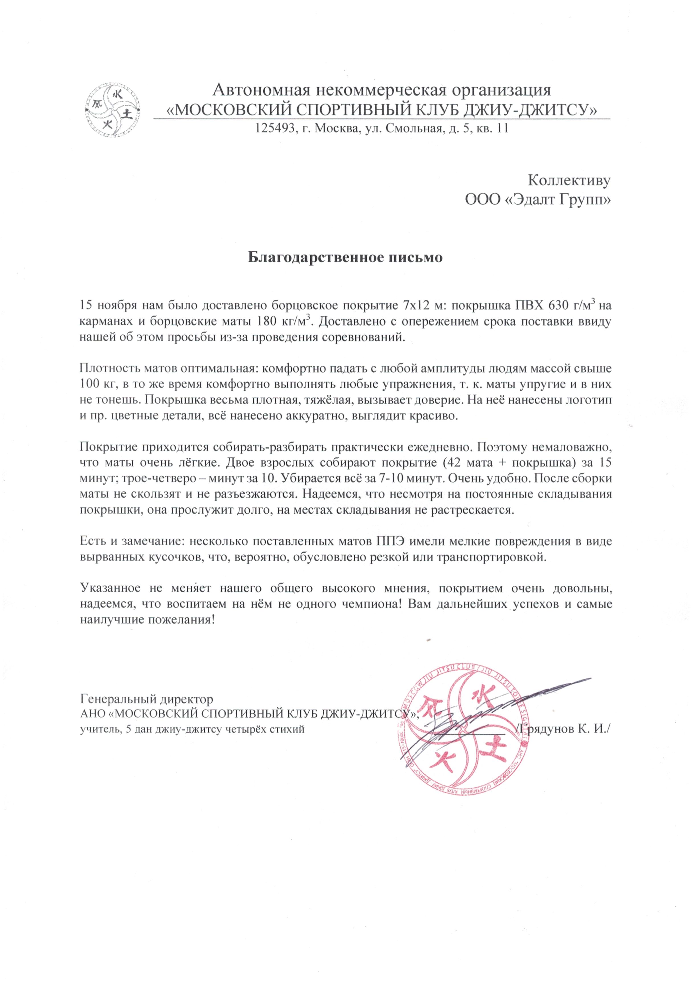 Указанное не меняет нашего общего высокого мнения, покрытием очень довольны, надеемся, что воспитаем на нём не одного чемпиона! Вам дальнейших успехов и самые наилучшие пожелания!"